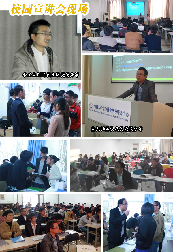 集團2013年度校園專場招聘宣講會于本月中上旬圓滿完成。此次宣講分別在合肥工業(yè)大學(xué)、安徽大學(xué)和黃山學(xué)院三所院校開展,總參會人數(shù)超過450人,收到各類專業(yè)畢業(yè)生簡歷近300份,其中安大和工大投簡歷學(xué)生超過240人。由于集團及企業(yè)的社會影響越來越大,今年宣講會現(xiàn)場效果好于往屆,投遞簡歷的學(xué)歷層次也大幅提高。