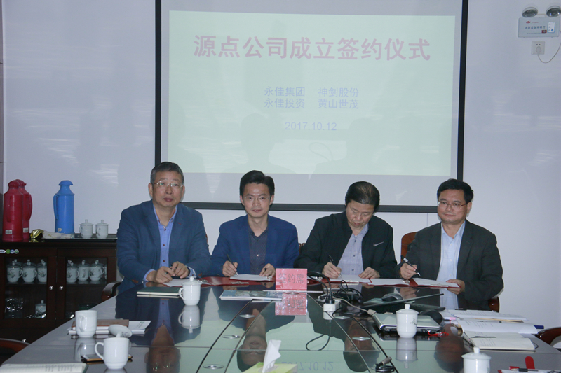 10月12日上午,永佳集團(tuán)、永佳投資、神劍股份和黃山世茂四家企業(yè)在集團(tuán)會議室正式簽約,合資成立黃山源點新材料科技有限公司。