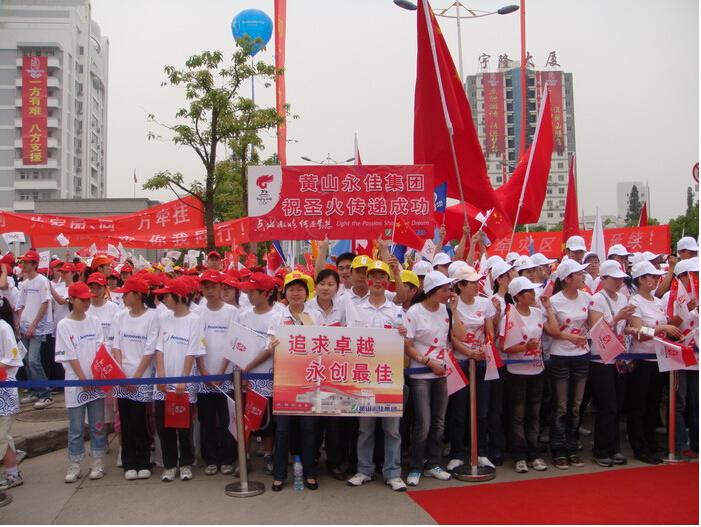 5月30日下午,期待已久的奧運火炬黃山站傳遞活動在屯溪舉行,奧運火炬手永佳集團董事、杜邦華佳公司副總經理汪鵬,代表永佳集團3500員工進行了火炬?zhèn)鬟f。集團組成60人方陣參加奧運火炬點火和回收儀式。